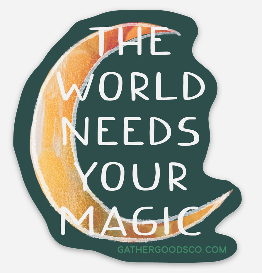 This magical crescent moon sticker says The World Needs Your Magic and features an illustration of a yellow crescent moon on a blue night sky background. It's perfect for a water bottle, laptop or anywhere else you want to put a waterproof sticker. Measures 2.71″ × 3″