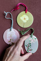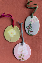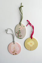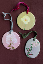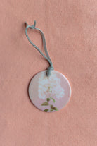 This elegant ceramic wall art ornament makes a beautiful keepsake gift for your christmas tree or as a wall hanging. Featuring an illustration of a hydrangea flower on a glossy porcelain disc and hung with a slate blue velvet ribbon, this ornament is sure to be a treasured addition to your Christmas tree and holiday decor or it can even be hung as a wall art medallion year round. Artwork is a print of an original botanical art piece by designer Michelle Smith of Gather Goods Co.