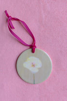 This ceramic keepsake christmas ornament also doubles as a colorful wall hanging with a butter yellow background and poppy art. The poppy flower painting is made with watercolor, collage and a variety of multimedia techniques. The ornament comes with an elegant velvet ribbon for hanging on a Christmas tree or displaying as a beautiful home decor accent. This collectible ceramic art piece looks great when hung on a wall as a collection of objects as well. The botanical prints on these ornaments are in pastel colors and make a great gift. These ceramic art pieces would make a great ornament display for a shop display especially at the holidays but year round as a wall art sculpture. Both modern and vintage feeling, the aesthetic of this ornament has a classic art appeal that will appeal to a variety of customers. Artwork is a print of an original botanical art piece by designer Michelle Smith of Gather Goods Co.