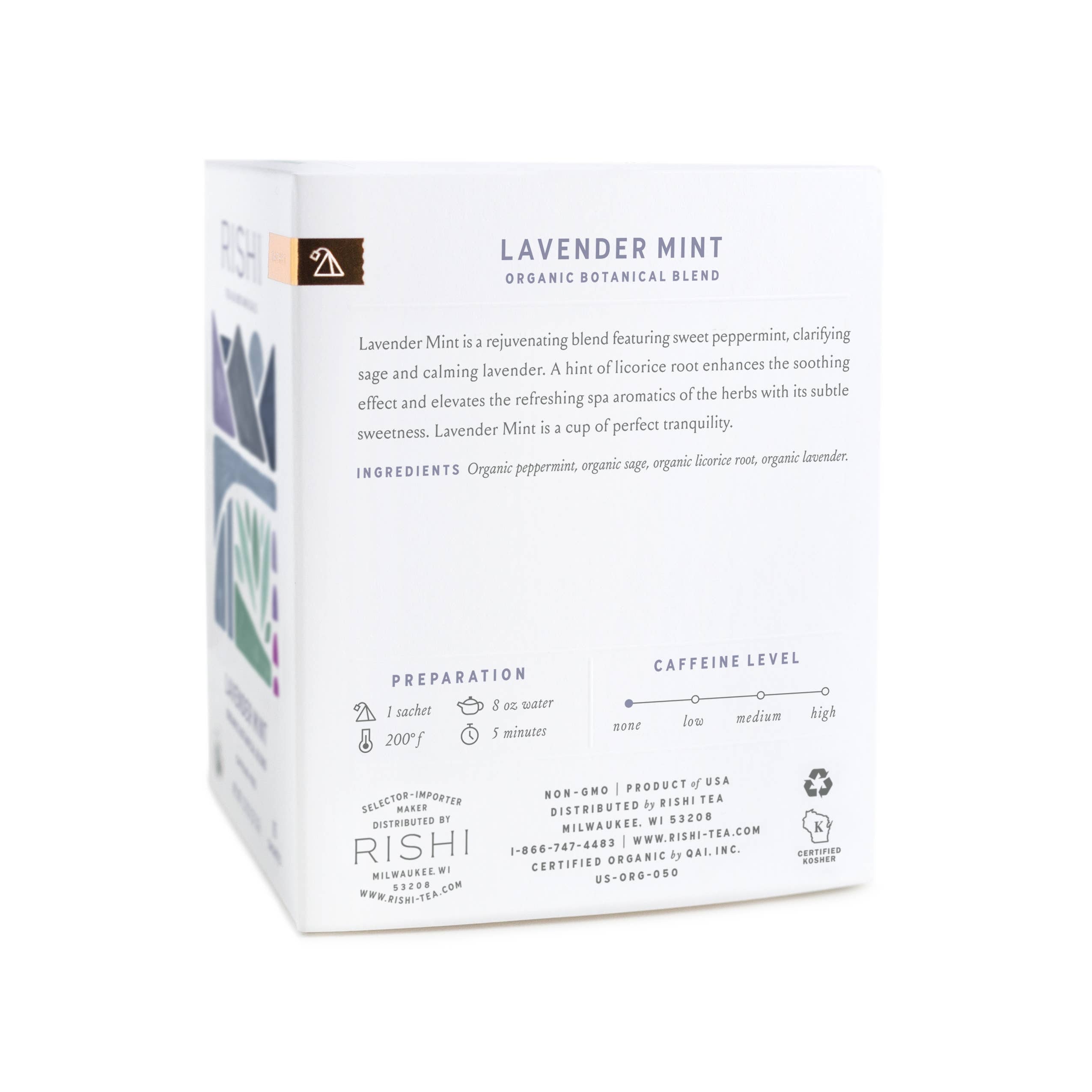 Lavender Mint is a rejuvenating blend featuring sweet peppermint, clarifying sage and calming lavender. A hint of licorice root enhances the soothing effect and elevates the refreshing spa aromatics of the herbs with its subtle sweetness. Lavender Mint is a cup of perfect tranquility.
