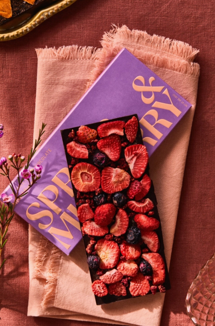 Bright and fruity with a tinge of tartness, this bar features delicious in-season strawberries, blueberries, and red raspberries that bring a mouthwatering jamminess to this dark chocolate.