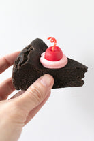 This chocolate cake candle is topped with a dollop of Strawberry frosting and a Cherry on top! Soy Wax Candle The candle is about 3.25 in L x 2.75 in W x 2 in H Each Cake is hand-poured, and candle color may vary slightly Cake Frosting & Cherry are hand-made Natural Coated, Cotton braided wick Hand-poured.