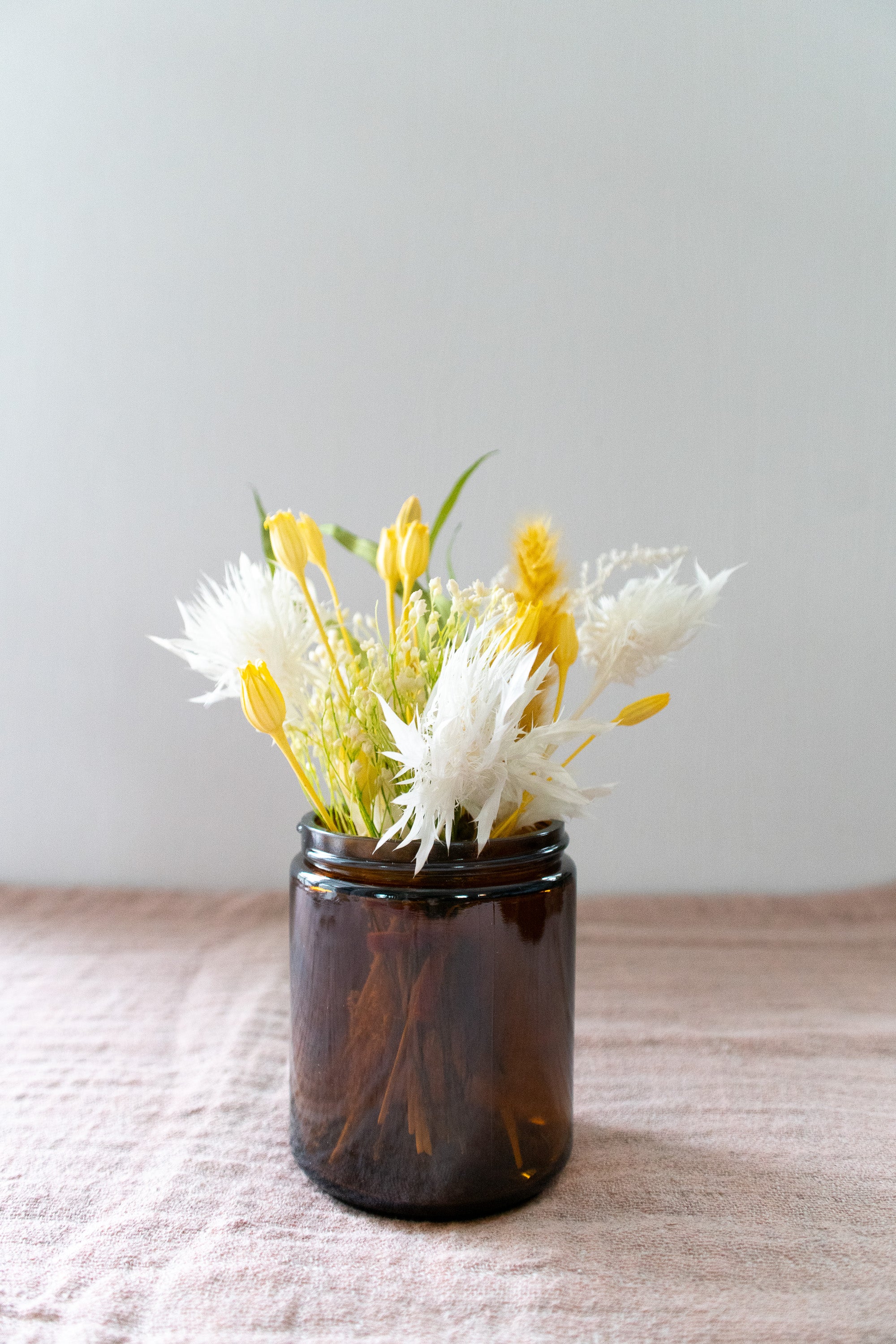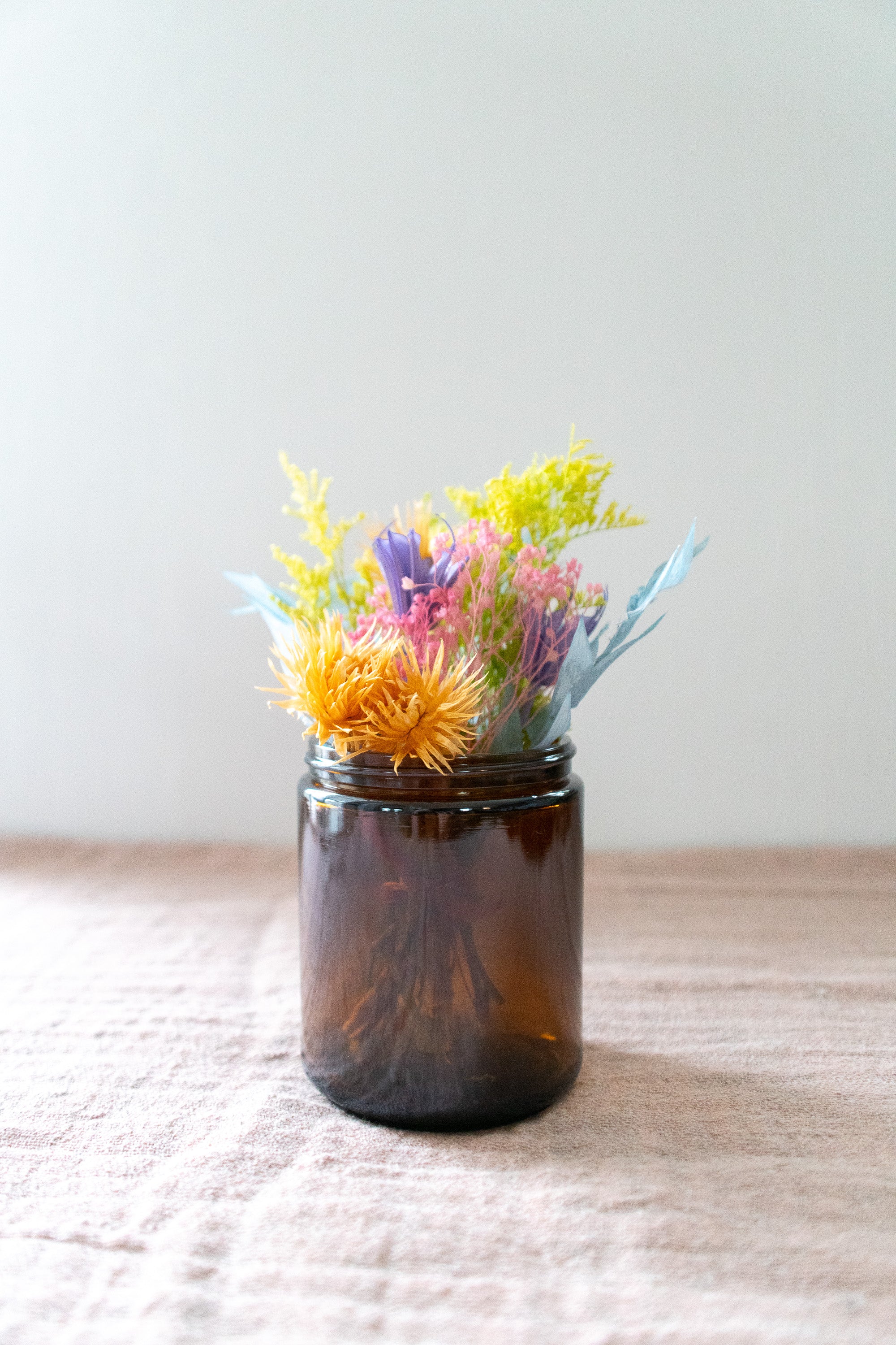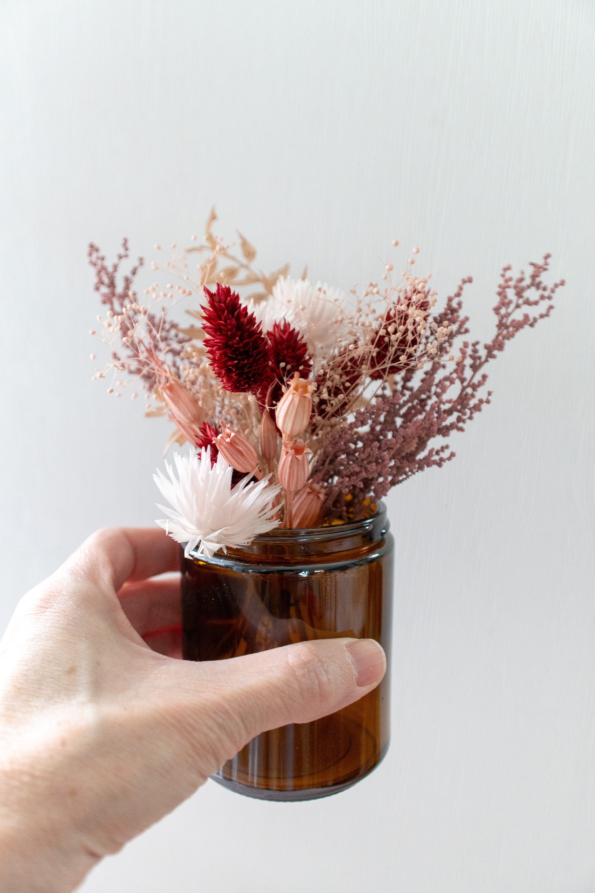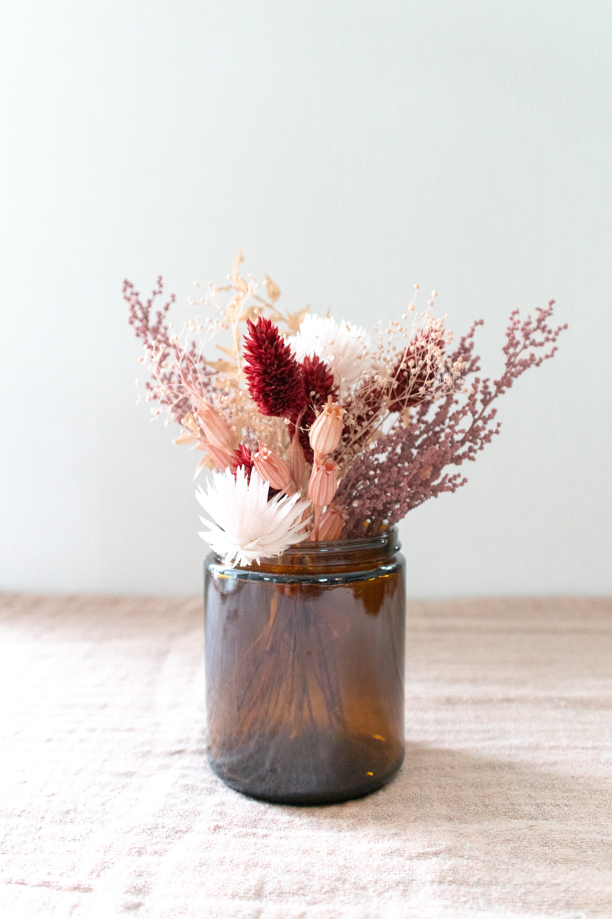 Petite Dried Flower Arrangement in An Amber Glass Jar