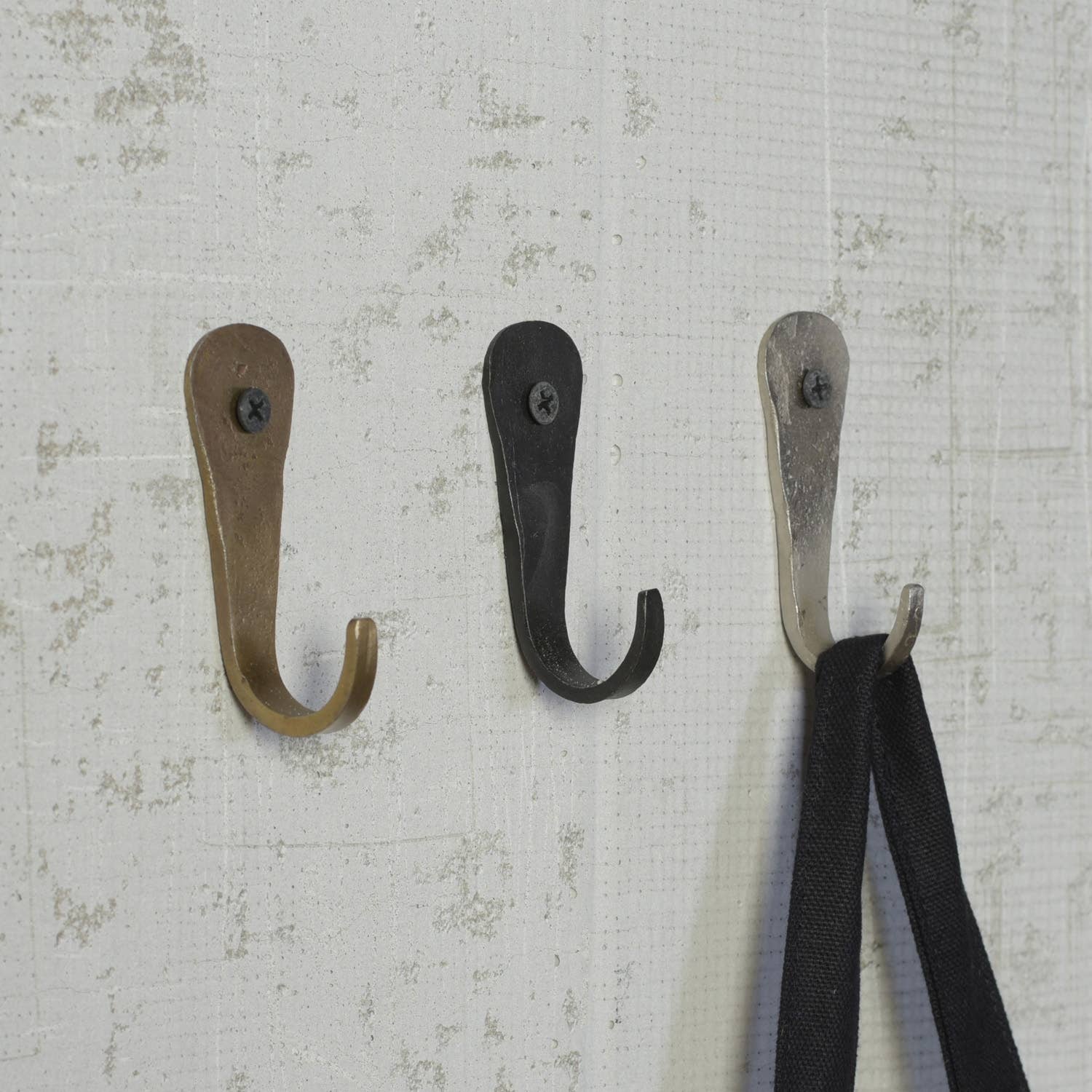 Simple forged iron hooks hold everything from keys to coats.