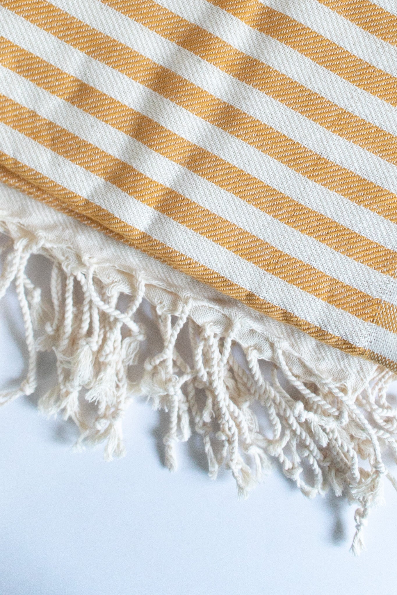 This beautiful hand-loomed Turkish tea towel is made with 100% cotton and features a mustard stripe. This versatile towel can be used as a beach or picnic blanket, a tablecloth, a throw for the back of your couch or even as a scarf. The weave of the fabric dries quickly and is naturally antibacterial. These towels are super absorbent and very lightweight. Measures 71"x 39". Also available in a variety of others colors.