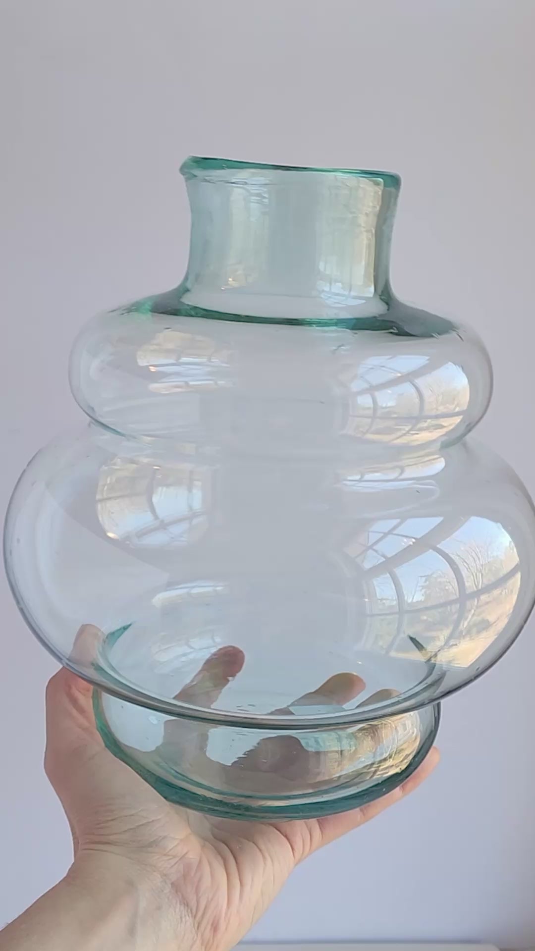 This Recycled Glass Vase is a stylish and sustainable piece made from 100% recycled glass. Its minimalist design features clean lines and a subtle, textured finish that complements any interior. Handcrafted by skilled artisans, each vase is unique, with slight variations in shape and color. Ideal for holding fresh flowers, branches, or as a decorative accent, it adds an elegant touch to any space. Measures 7.9" in diameter with a subtle green glass hue.