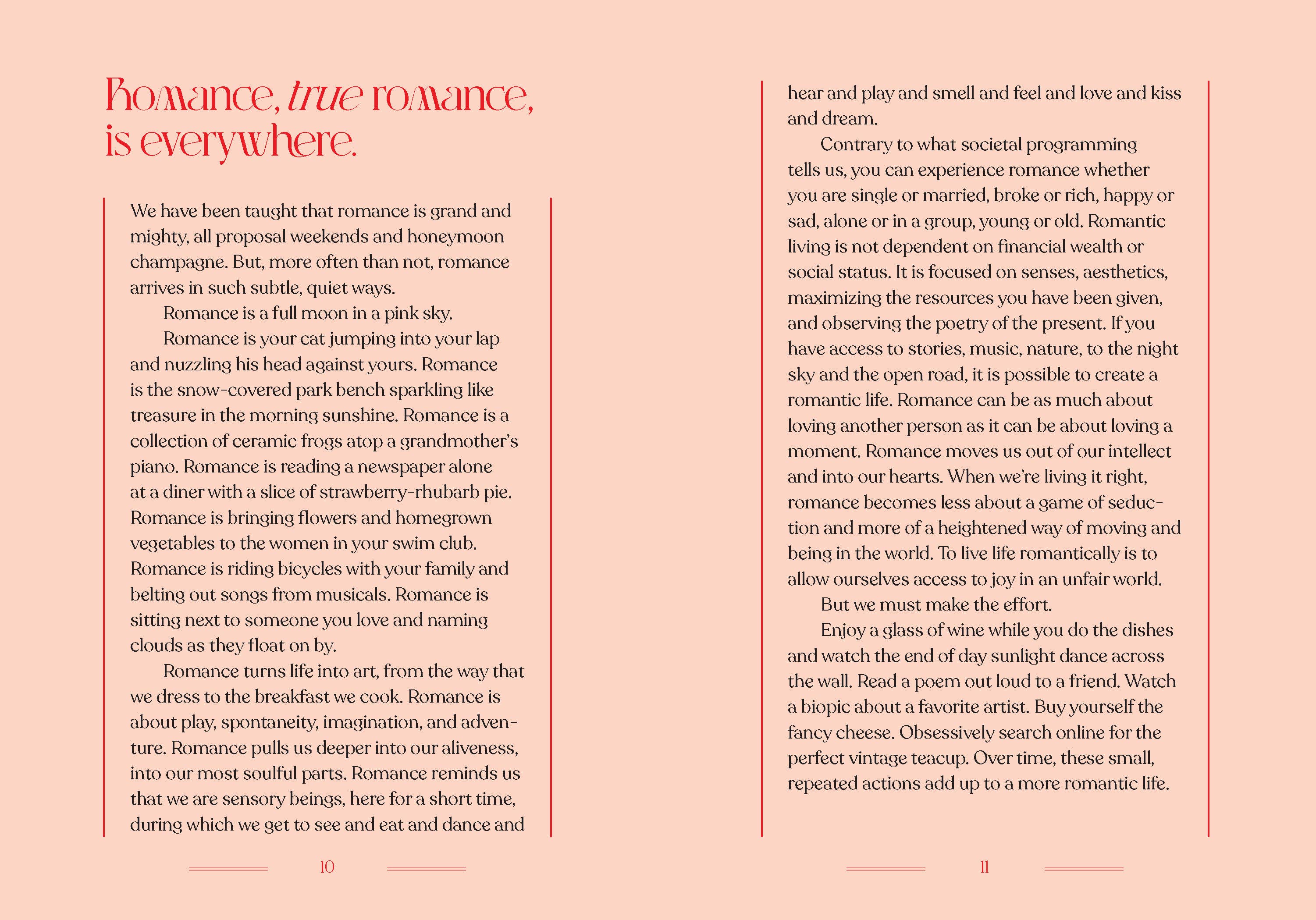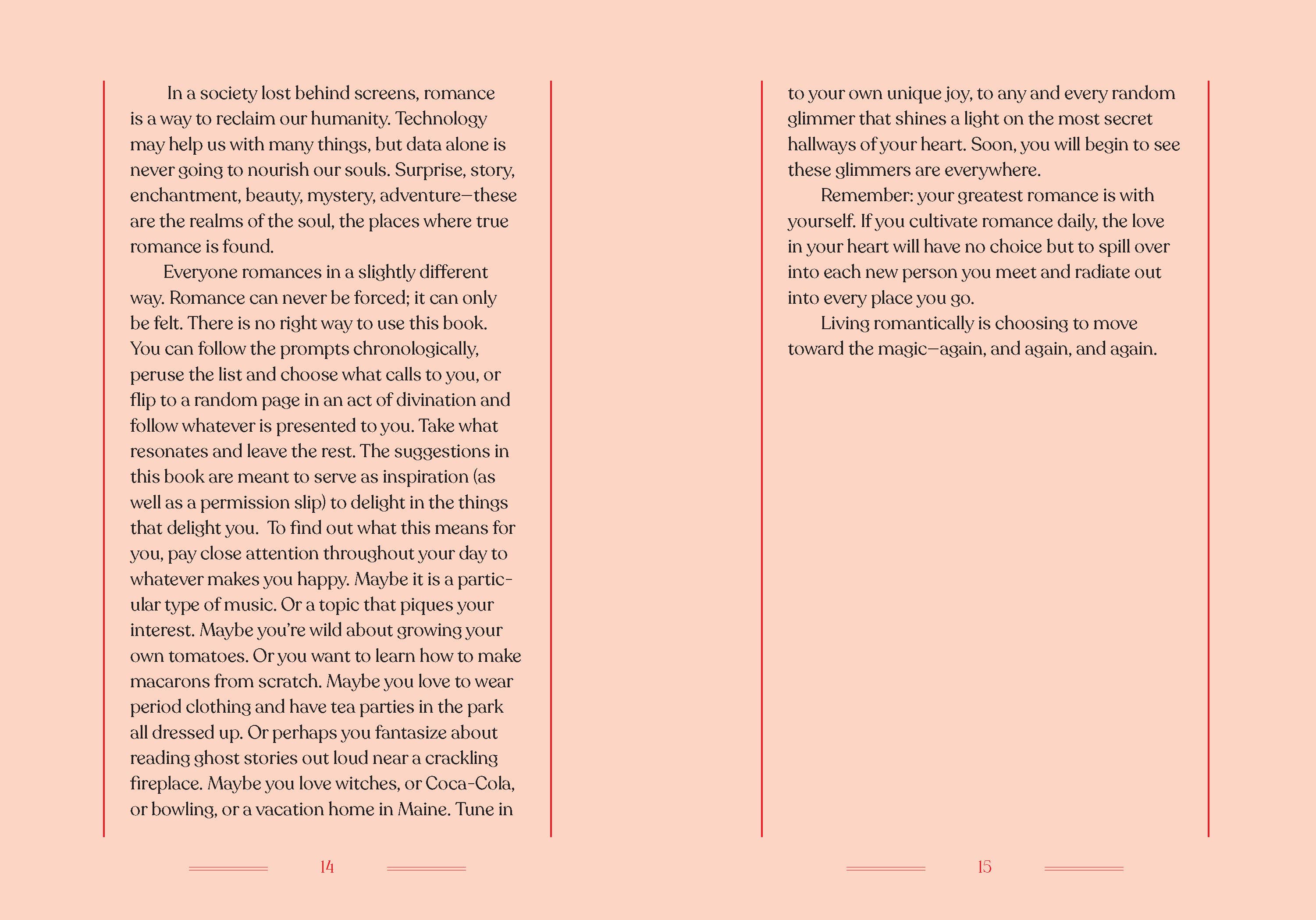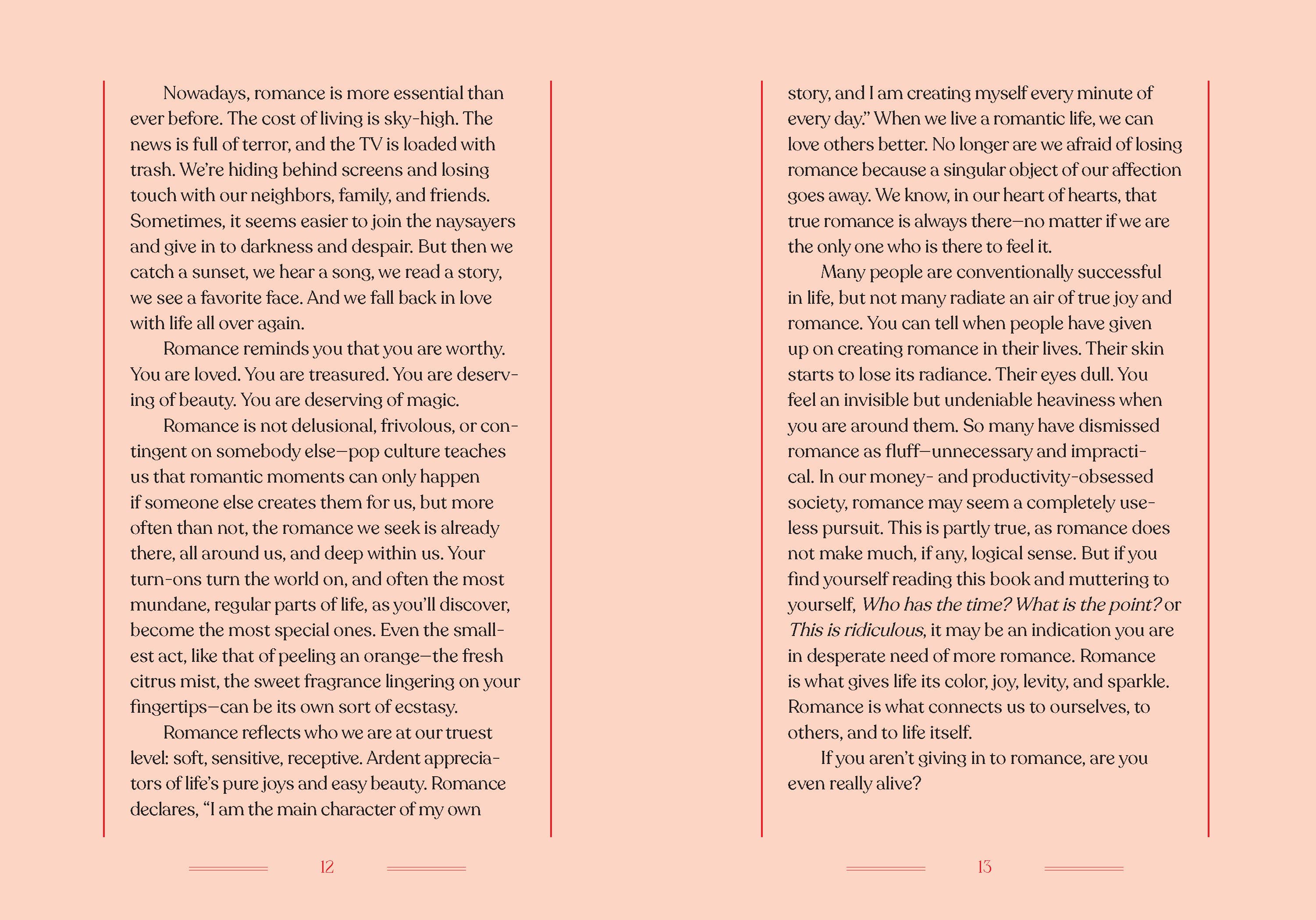 Between the pulls of work, family, friends, and the unrelenting speed at which our world churns, it can be hard to find pockets of joy. Romance the Every Day aims to make the far-more-frequent ordinary moments of our lives a bit sweeter with 52 thoughtful and accessible ideas—one for every week of the year.