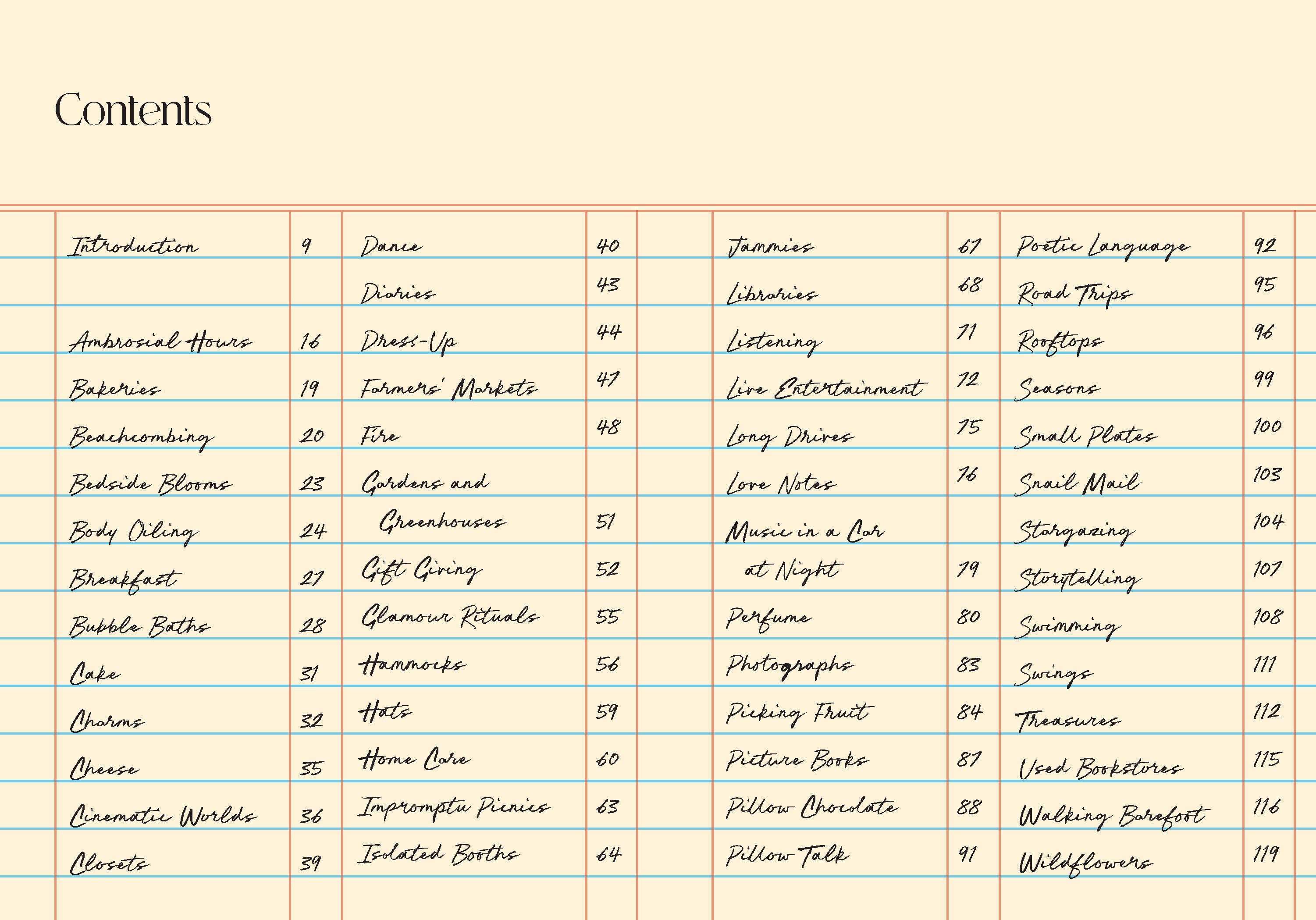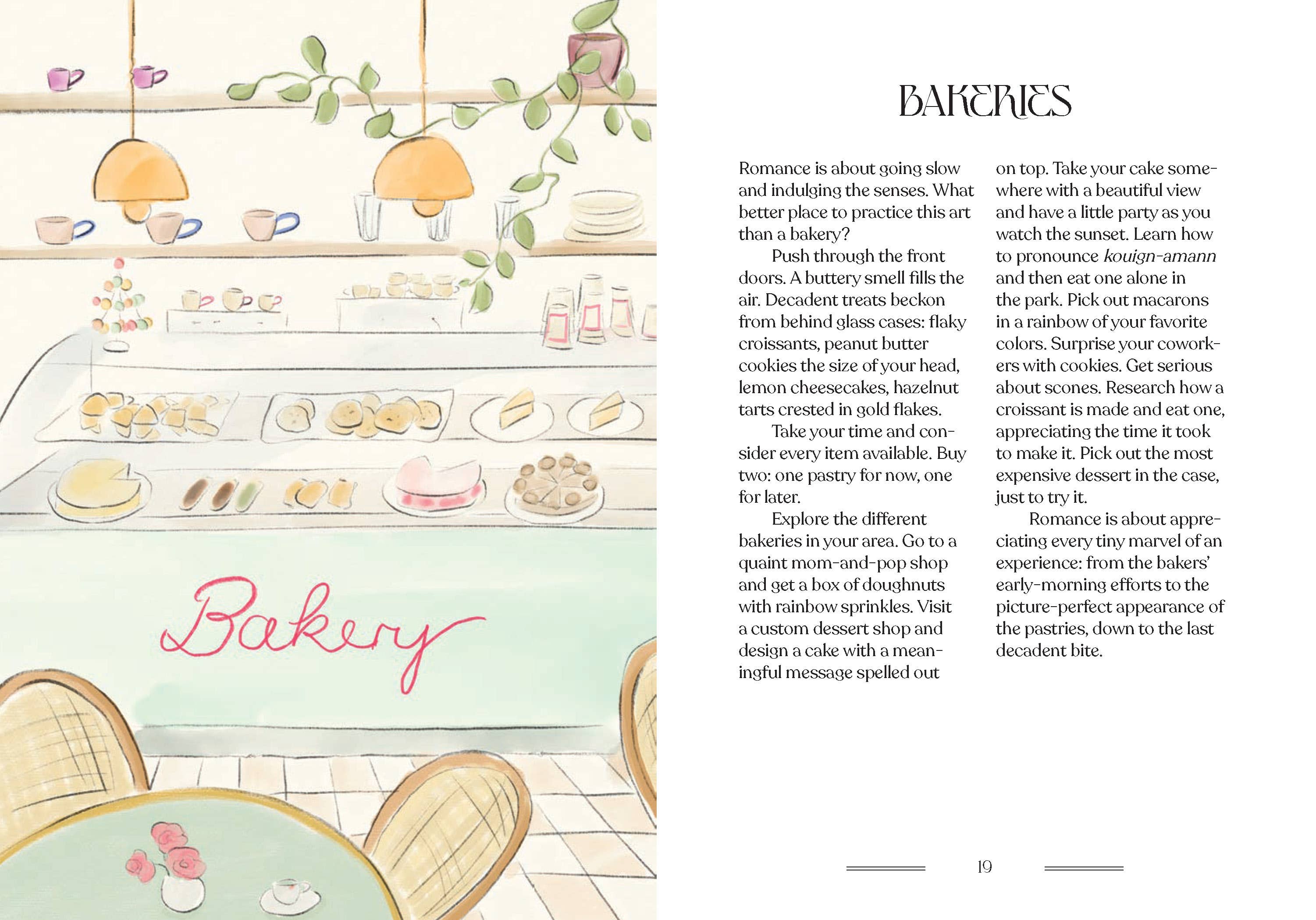 Ranging from the simple and sublime topic of “Cake” to the adventuresome pull of “Road Trips,” and illustrated with charming watercolor artwork throughout, this guide is full of small and easy-to-implement tweaks that can transform a daily routine into something magical.