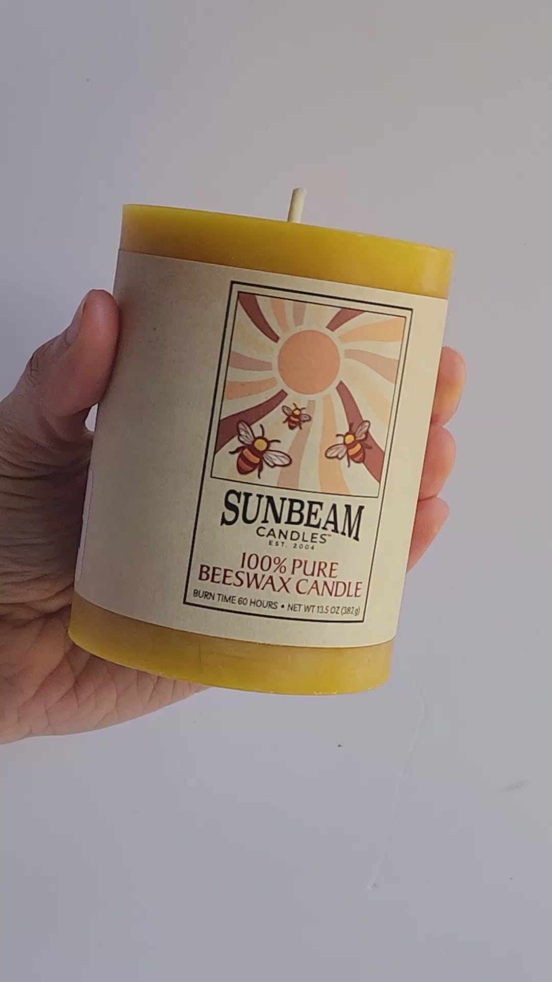 Beeswax candles have the prettiest golden glow when burned. These 100% pure beeswax pillars look lovely in a hurricane glass on a table to make things a little cozier. Beeswax candles have a natural slightly sweet aroma from the honey itself. Beeswax candles also burn longer than typical candles as well. This pillar measures 3x4".