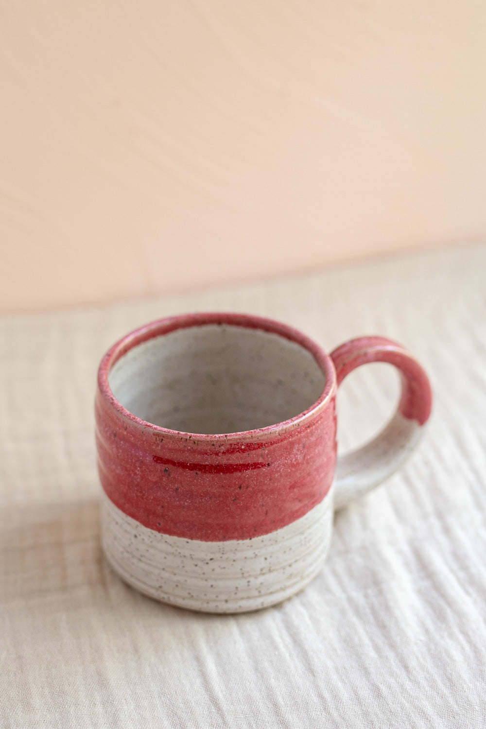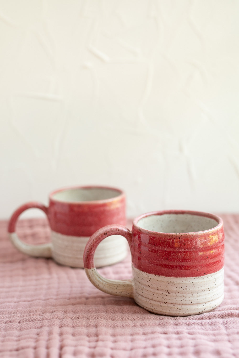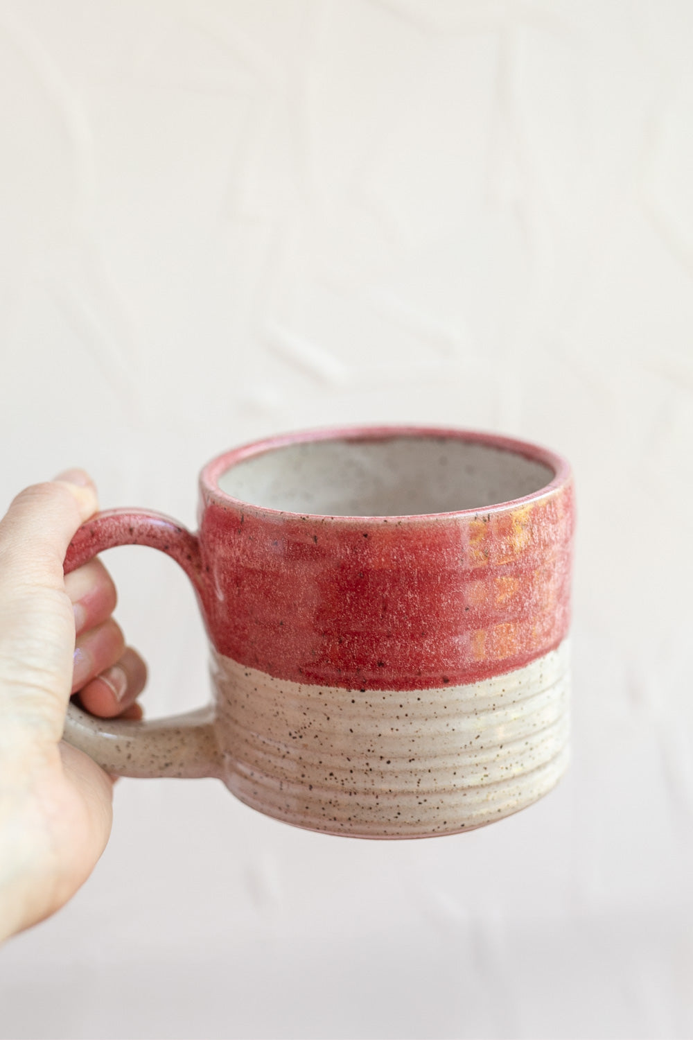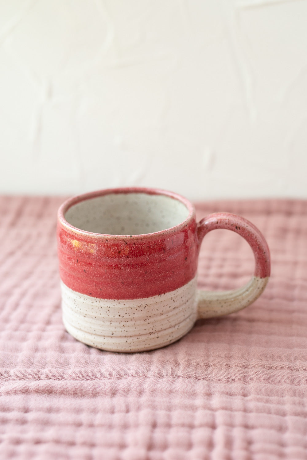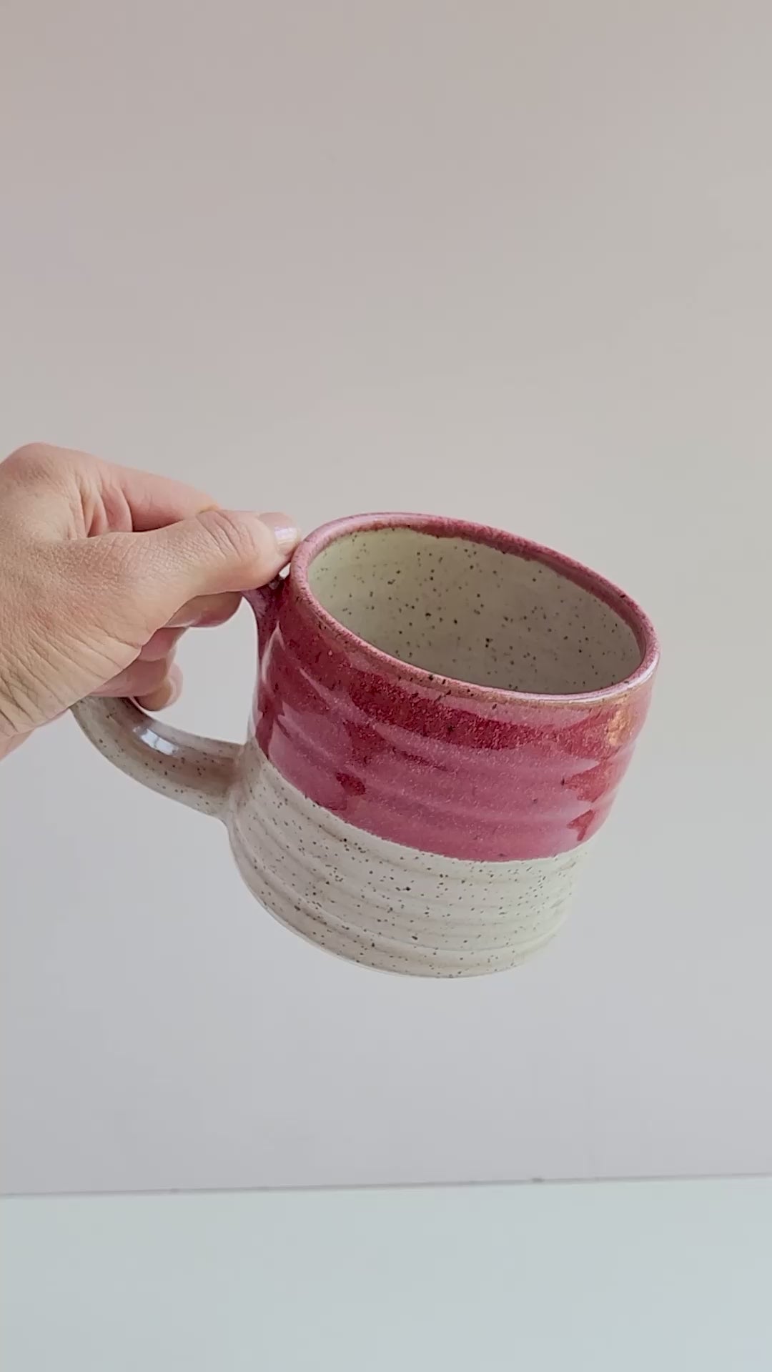 This beautiful hand-thrown frosted cherry and cream stoneware ceramic mug, approximately 12-14 oz. It is hand-thrown and hand-glazed. Food, dishwasher, and microwave safe. It measures approximately 3 1/2 inches wide and 3 inches high. All our ceramic items are handmade and will vary from one to the next. No 2 pieces will be exactly the same. Colors may vary slightly.