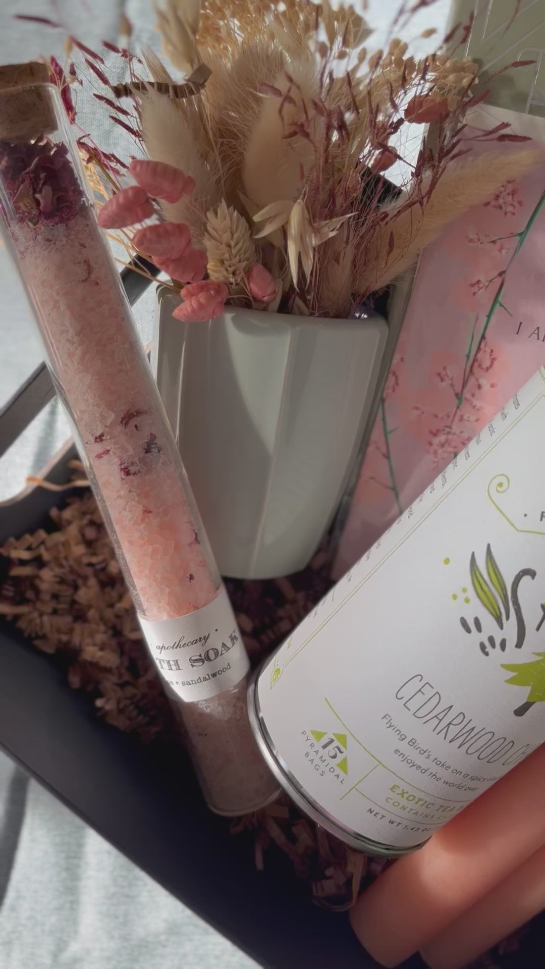 Inside the basket is a dark chocolate with sea salt artisan chocolate bar for her favorite indulgence, rose & sandalwood bath salts for a relaxing soak in the tub, a mini vase with a dried flower arrangement that will last forever, a tin of delicious chai tea for her morning drinking and a set of pale peach colored candle tapers for making everyday meals more special. In addition, there is a Gather Goods Co greeting card that says "I Appreciate You" on a beautiful lavender colored floral background.