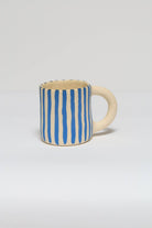 Handmade ceramic mug featuring a hand painted stripe design in colorful underglaze. The interior + lip of the mug are coated in a clear glaze. Size is around 12 oz.