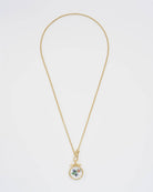 This exquisite necklace transports you to a nostalgic time, evoking the charm of a bygone era. It features a captivating design of two gracefully rendered swallows, elegantly framed as if viewed through a sophisticated monocle. Every intricate detail of the birds and accompanying floral elements is meticulously hand-finished, showcasing artisanal craftsmanship. The gold plating boasts a matte finish, lending the piece a rich, vintage feel that enhances its allure. 22ct Worn gold plated brass, zinc alloy, enamel ,glass 41cm (16") Chain with 5cm (2") extender; Pendant: 22mm height x 22mm width Wipe clean with a soft cloth